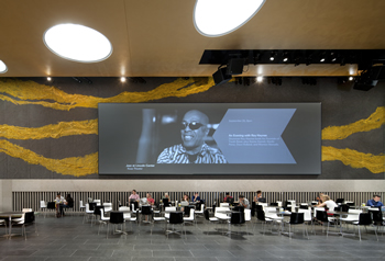 A special challenge in designing the subs was the thin space that was available for them-only 7 inches of clearance between the screen itself and the concrete wall behind the screen, spaced along its entire length. As a result of this configuration, no matter where a visitor stands in the Atrium space, the bass is uniform.